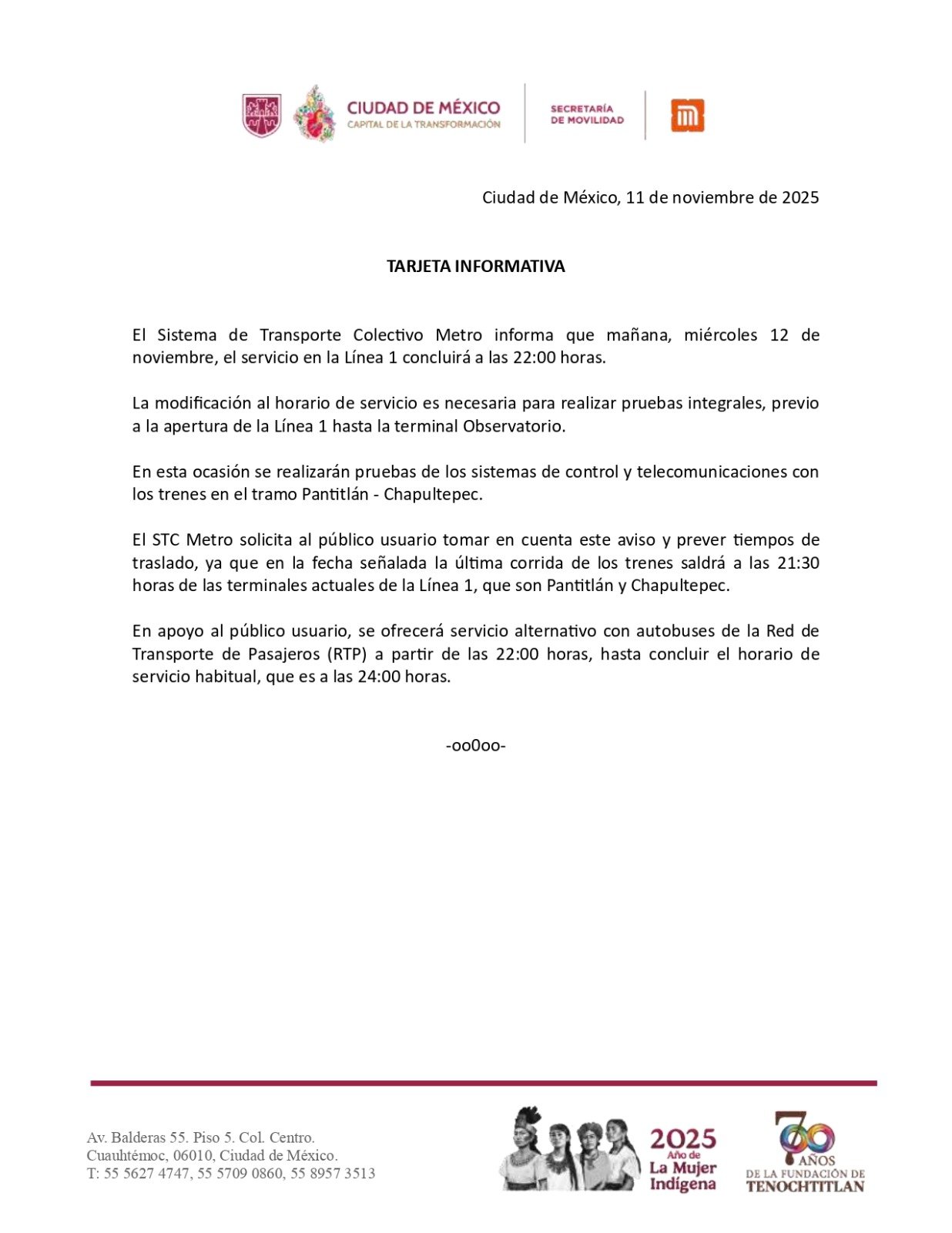 El STC Metro solicitó al público usuario tomar en cuenta este aviso y prever tiempos de traslado, pues la última corrida de trenes saldrá a las 21:30 horas de las terminales actuales de la Línea 1, que son Pantitlán y Chapultepec.