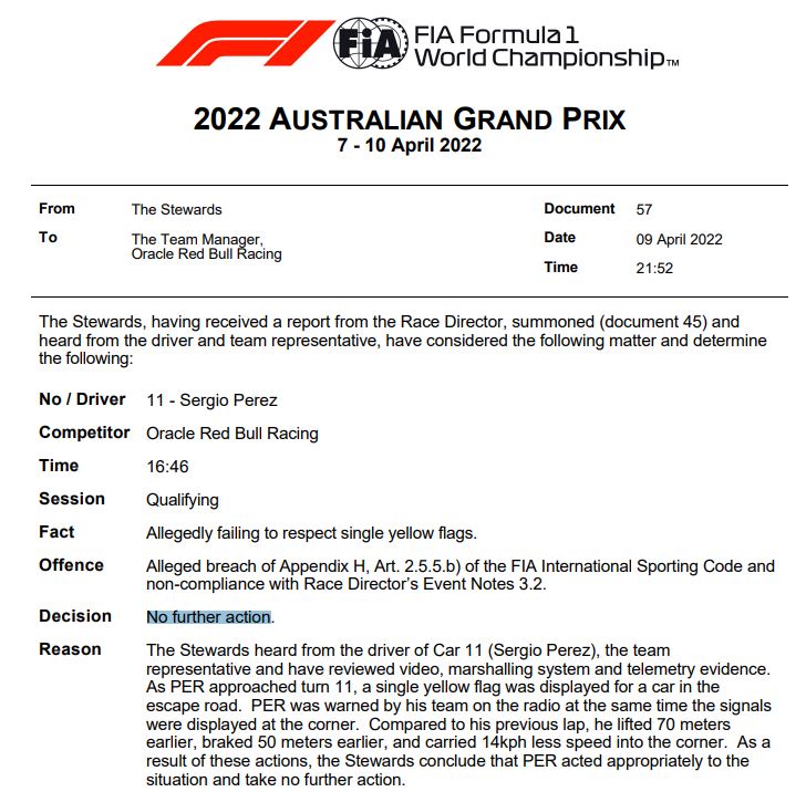 Durante la Q2 y mientras el mexicano Checo Pérez encaraba la curva 11 del circuito de Albert Park ondeaba la bandera amarilla, en ese momento se pensó que el azteca había mantenido su ritmo a pesar de la aparición de la señal de advertencia; sin embargo, la investigación demostró todo lo contrario.