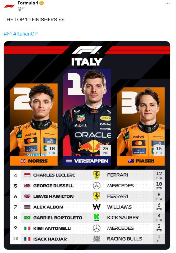 La Temporada 2025 de la Fórmula 1 sigue regalando grandes momentos, entre ellos el importante triunfo que consiguió Max Verstappen (Red Bull) en el Gran Premio de Italia, carrera en la que Oscar Piastri y Lando Norris acompañaron en el podio al neerlandés.