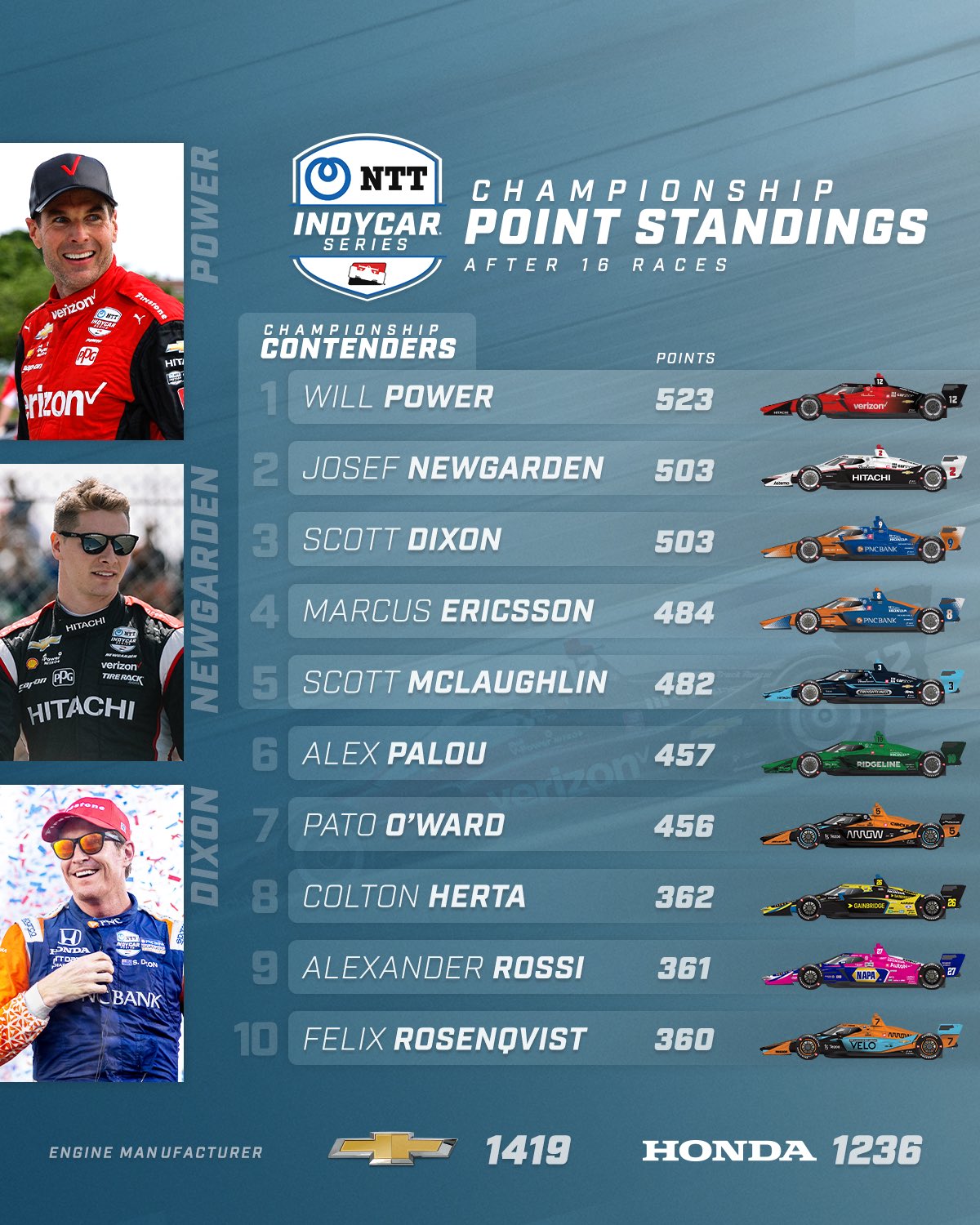 En otro sentido, Ericsson no parece una amenaza seria para Power en Laguna Seca pese a que matemáticamente tenga posibilidades (se encuentra a 39 puntos).