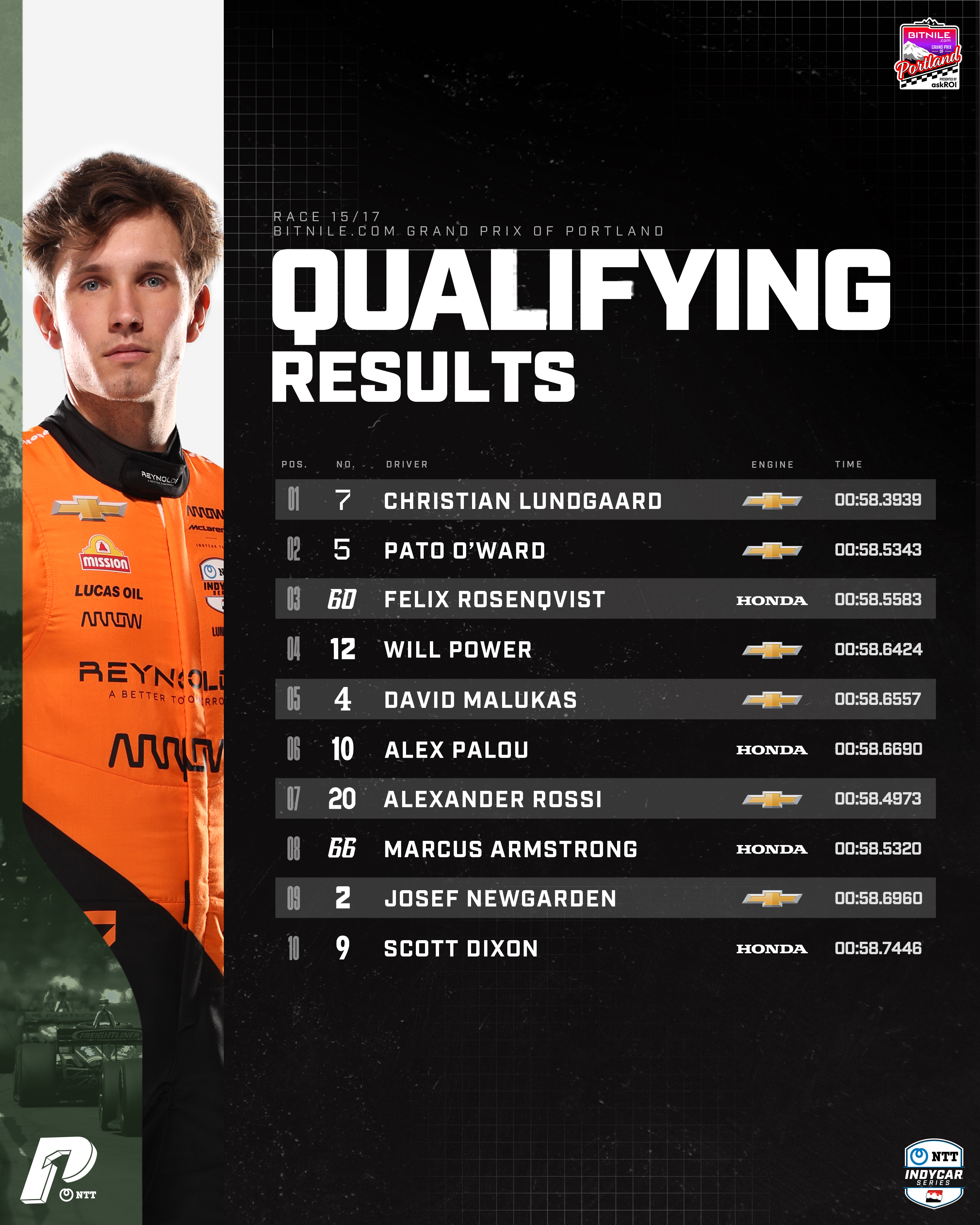 Lundgaard hizo un tiempo de 58.393 segundos, mientras que O'Ward se quedó a +0.141 y Palou a +0.275.