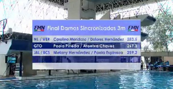 Carolina Mendoza y Dolores Hernández se adjudicaron el primer sitio con una sumatoria de 283.50 unidades, tras finalizar las cinco rondas de saltos. Para el segundo peldaño quedaron Paola Pineda y Arantxa Chávez, quienes consiguieron un total de 267.30 puntos.
