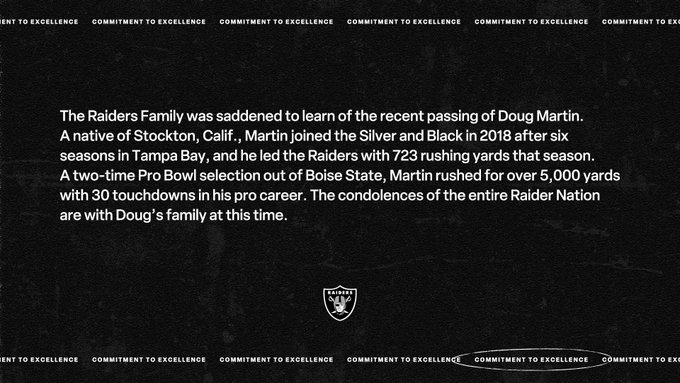 "La familia de los Raiders se entristeció al enterarse del reciente fallecimiento de Doug Martin. Originario de Stockton, California, Martin se unió al equipo Plata y Negro en 2018, tras seis temporadas en Tampa Bay, y lideró a los Raiders con 723 yardas por tierra esa temporada. Seleccionado dos veces al Pro Bowl proveniente de Boise State, Martin corrió para más de 5,000 yardas y anotó 30 touchdowns en su carrera profesional. Las condolencias de toda la Nación Raider están con la familia de Doug en este momento"