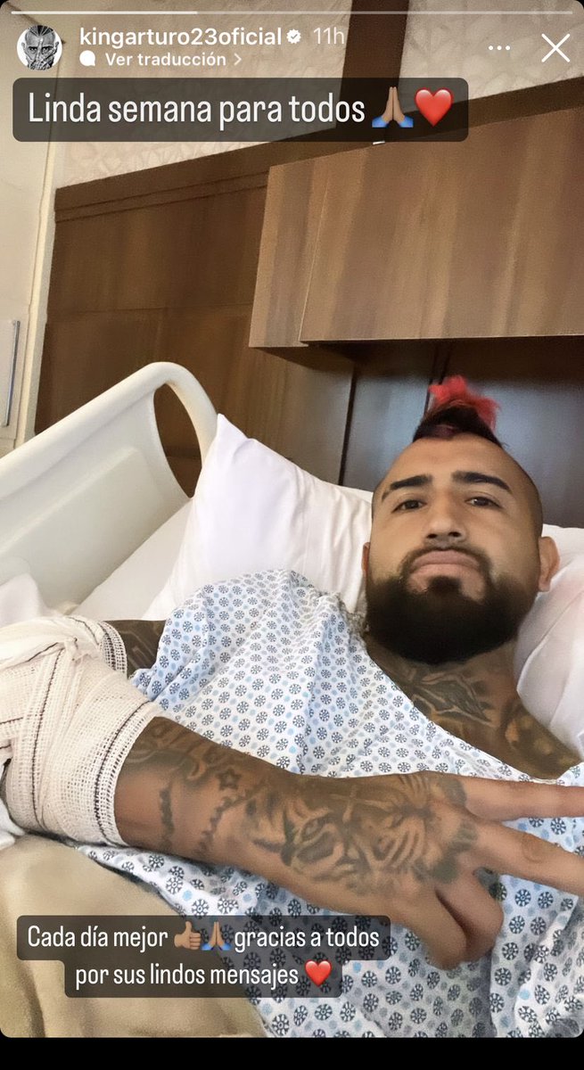 "Cada día mejor, gracias a todos por sus lindos mensajes", escribió el capitán de La Roja en una historia en su cuenta en Instagram. Vidal, de 35 años de edad, acompañó la publicación con una foto desde el centro médico en la que se observa un vendaje en el codo del brazo izquierdo.