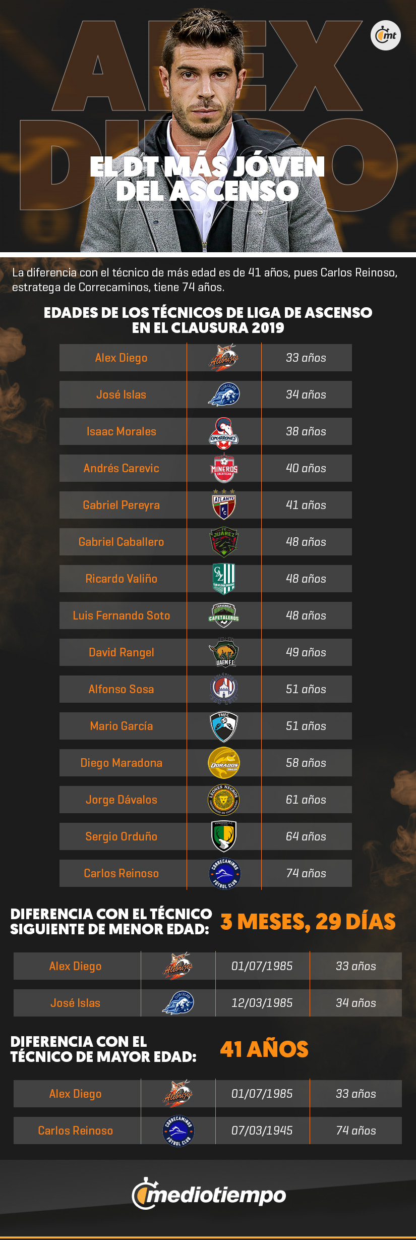 El estratega del conjunto oaxaqueño nació en 1 de junio de 1985 y su más cercano competidor en juventud es el director técnico de Celaya, José Islas, quien tiene 34 años, pero con una diferencia de 3 meses y 29 días.