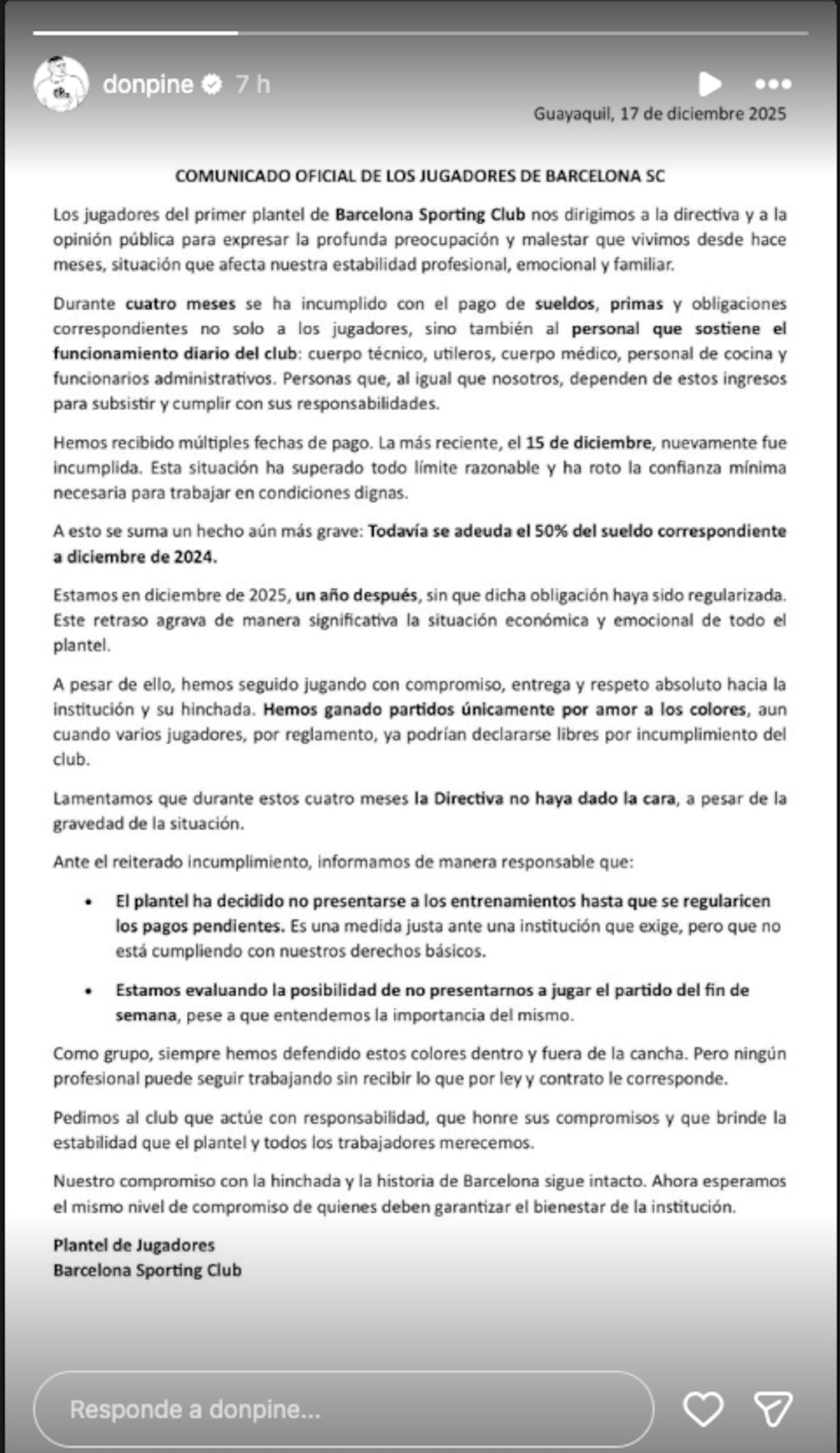Durante este miércoles 17 de diciembre, Pineda publicó en su cuenta de Instagram la falta de pagos por parte de Barcelona SC.