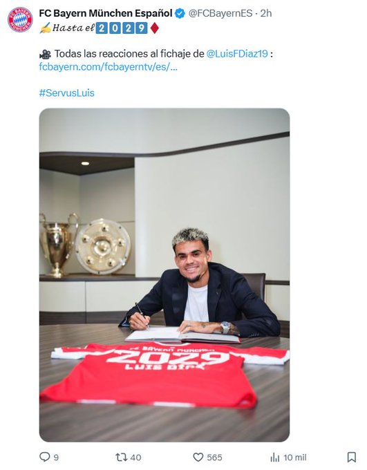 Bayern Munich hizo oficial este miércoles el fichaje del internacional colombiano Luis Díaz, quien llega a la Bunsdeliga procedente del Liverpool, quien ha firmado un contrato con el conjunto bávaro hasta mediados de 2029 y lucirá el dorsal con el número 14.