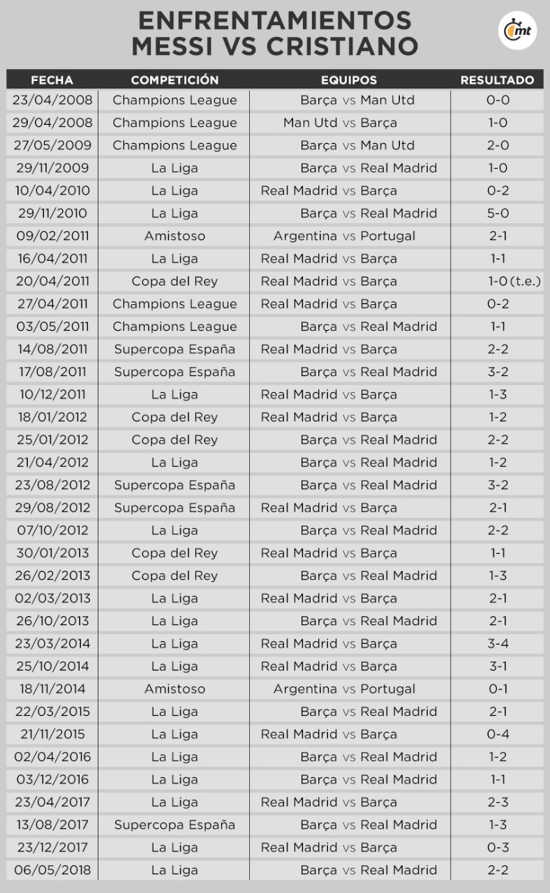 La primera vez que se cruzaron Leo y Cristiano fue en 2008 en un Barcelona vs Manchester y desde entonces se han encontrado otras 34 veces, entre Champions, Liga Española, Copa del Rey y Supercopa de España.