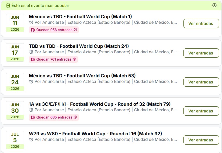 Los dos primeros encuentros en la capital mexicana son de alta demanda: "Este evento se encuentra entre el 25 por ciento de los eventos principales en Copa Mundial de Futbol. Se posiciona así según la tasa de visitantes únicos de la página de este evento en el última día", se puede leer en el sitio.