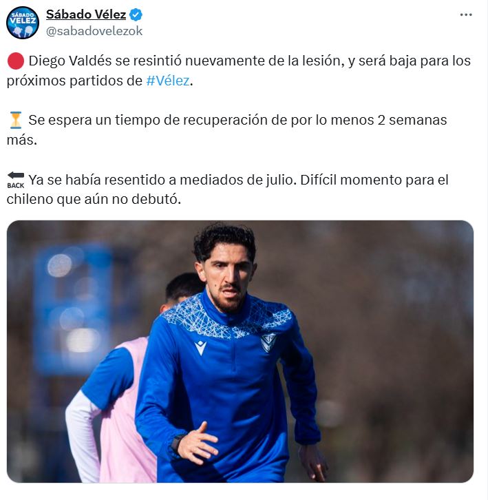 "Diego Valdés se resintió nuevamente de la lesión, y será baja para los próximos partidos de Vélez. Se espera un tiempo de recuperación de por lo menos 2 semanas más", detalló la cuenta @sabadovelezok en su cuenta de X (antes Twitter). "Esto es una lesión en el sóleo que tuvo cuando llegó a Vélez y de la que ya se resintió dos veces", agregó.