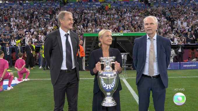 ¡Las leyendas se hacen presentes! Jürgen Klinsmann, Bernard Dietz y Heidi Beckenbauer cargan el trofeo de la Eurocopa