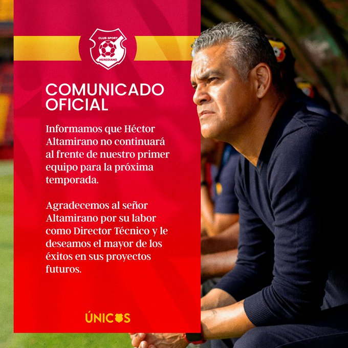 Herediano hizo oficial que Héctor Altamirano no continuará al frente del equipo para la próxima temporada, esto después de que la directiva analizó su continuidad tras la eliminación del cuadro ante la Liga Deportiva Alajuelense.