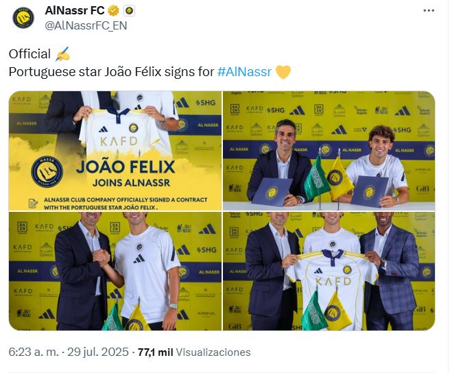 El portugués Joao Félix fichó con el Al-Nassr, equipo donde se reencontrará con su compatriota Cristiano Ronaldo, quien firmó un nuevo contrato con este equipo en junio, anunció la entidad este martes a través de sus redes sociales.