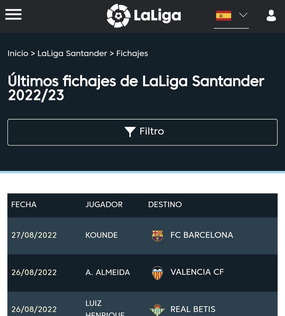 Asimismo, cabe señalar que el futbolista ya aparece como nuevo fichaje del conjunto culé en la página de LaLiga, así como Almeida y Luiz Henrique en Valencia y Betis, respectivamente.