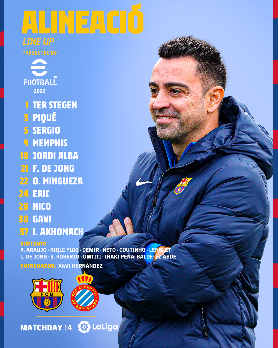 Xavi Hernández se estrenará como entrenador del FC Barcelona en un Derbi ante el Espanyol y el estratega apuesta por una base de jóvenes de inicio.