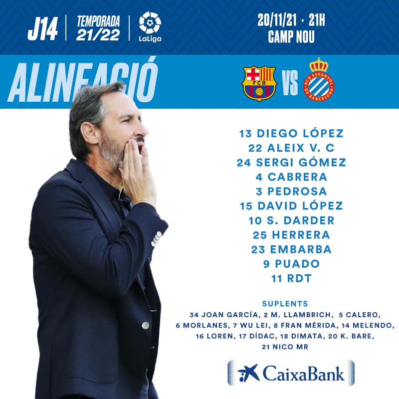 Los Periquitos saltarán al Camp Nou con Diego López, Aleix Vidal, Sergi Gómez, David López, Leandro Cabrera, Adrià Pedrosa, Yangel Herrera, Sergi Darder, Adrián Embarba, Javier Puado y Raúl De Tomás.