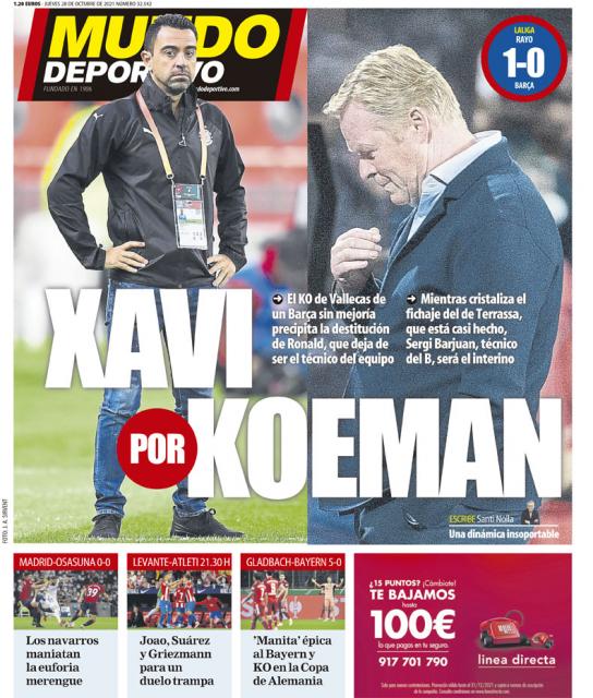 También su competidor Sport, tras hablar de un Koeman "fulminado", apunta a que Xavi Hernández "se perfila como el nuevo inquilino del banquillo azulgrana".