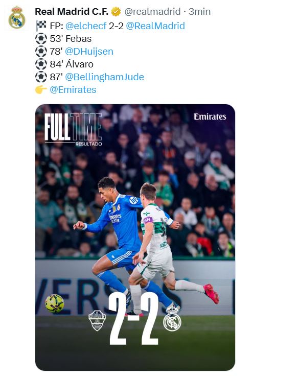 Aunque sufrió de más, Real Madrid logró rescatar un punto de oro en su visita a la casa del Elche tras igualar 2-2, equipo que en dos ocasiones se puso al frente en el marcador y que incluso se quedó a pocos minutos de protagonizar la sorpresa de la Jornada 13 de LaLiga.