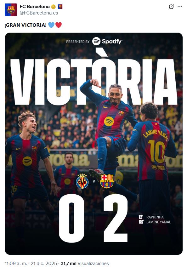 FC Barcelona cerró su actividad en el 2025 con el pie derecho, pues sumó tres puntos claves en su camino rumbo al título de la Temporada 2025-26 de LaLiga al vencer 2-0 al Villarreal en la cancha del Estadio de la Cerámica.
