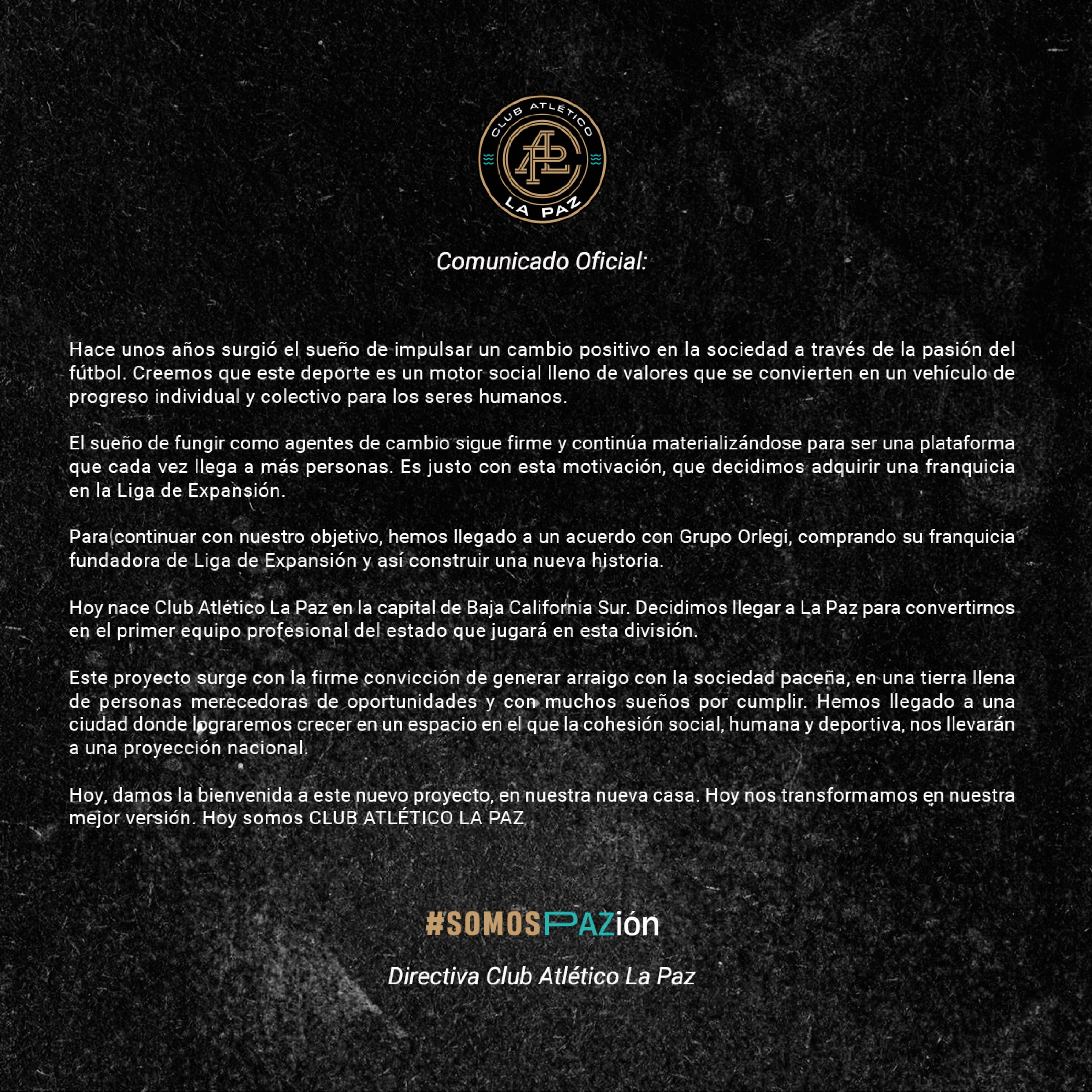 "Para continuar con nuestro objetivo, hemos llegado a un acuerdo con Grupo Orlegi, comprando su franquicia fundadora de Liga de Expansión y así construir una nueva historia. Hoy nace Club Atlético La Paz en la capital de Baja California Sur. Decidimos llegar a La Paz para convertirnos en el primer equipo profesional que jugará en esta división".