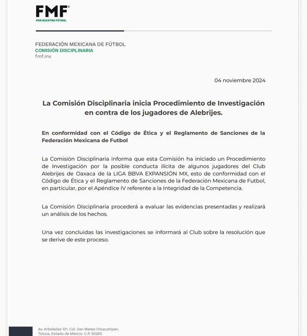 “Esta Comisión ha iniciado un Procedimiento de Investigación por la posible conducta ilícita de algunos jugadores del Club Alebrijes de Oaxaca de la LIGA BBVA EXPANSIÓN MX, esto de conformidad con el Código de Ética y el Reglamento de Sanciones de la Federación Mexicana de Futbol, en particular, por el Apéndice IV referente a la Integridad de la Competencia”