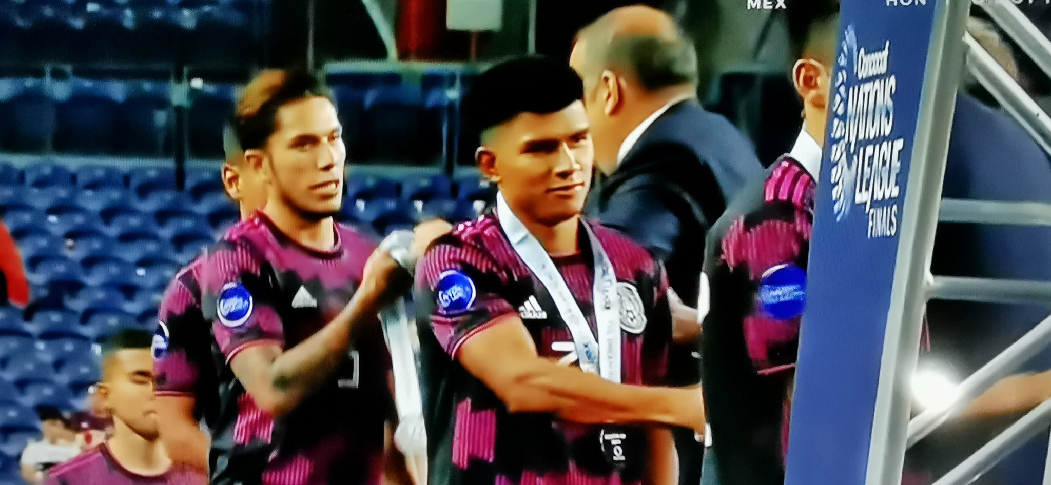 En la ceremonia de la Nations League, todos los jugadores del Tri recibieron su presea en el cuello, pero Salcedo la tomó con la mano y nunca la portó.