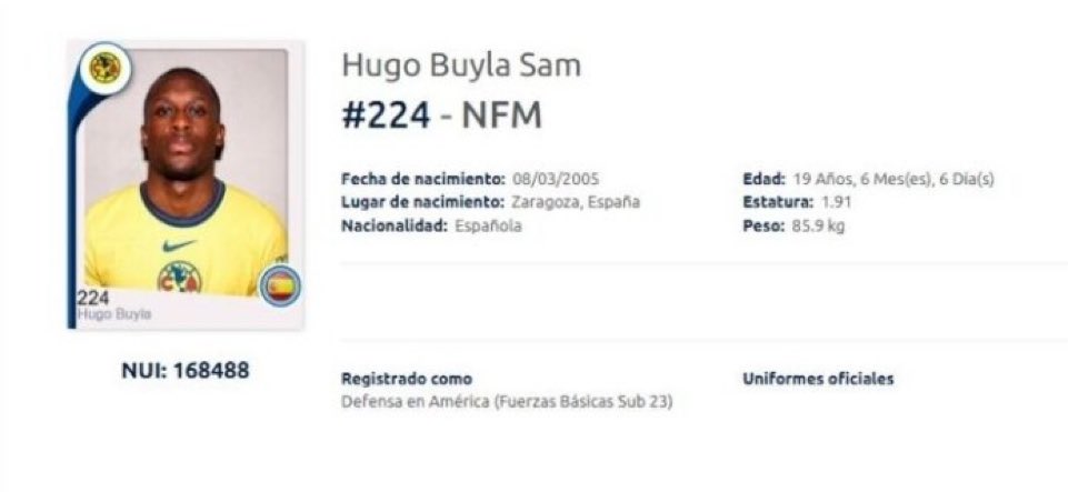 Se trata de Hugo Buyla Sam, jugador nacido en España que llega para apuntalar la retaguardia del equipo Sub-23 de las Águilas, que este sábado empató 2-2 con Chivas en el Clásico Nacional.