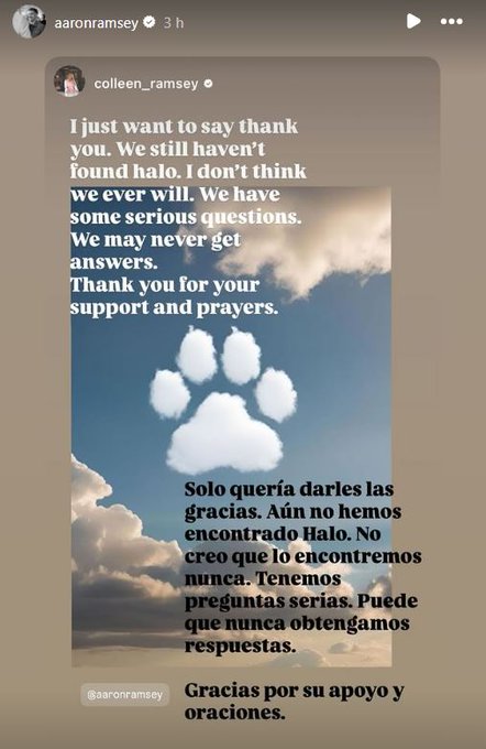 "Solo quería darles las gracias. Aún no hemos encontrado a 'Halo'. No creo que la encontremos nunca. Tenemos preguntas serias. Puede que nunca obtengamos respuestas. Gracias por su apoyo y oraciones", compartieron tanto Colleen como Aaron Ramsey.