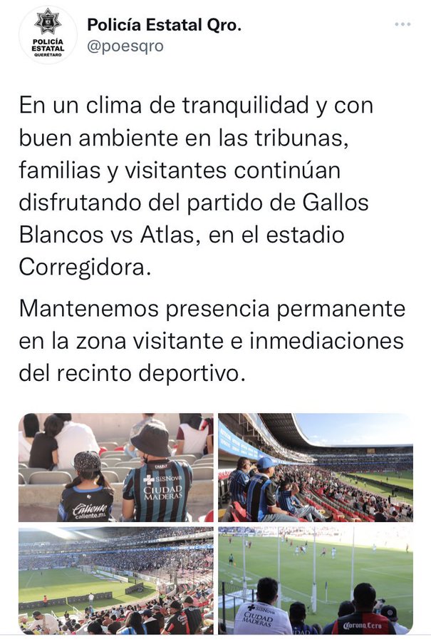 Previo a que se registraran los hechos de violencia en las gradas del Estadio La Corregidora, la cuenta de Twitter de la Policía Estatal Querétaro compartió varias fotografías del operativo que realizó antes del arranque del cotejo, además de que aseguró que se desarrollaba un juego entre Gallos y Atlas en un "clima de tranquilidad y con buen ambiente en las tribunas".