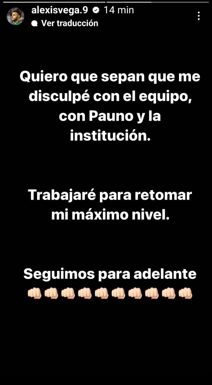 "Quiero que sepan que me disculpé con el equipo, con Pauno y la institución. Trabajaré para retomar mi máximo nivel. Seguimos para adelante", fue el texto que publicó Alexis Vega.