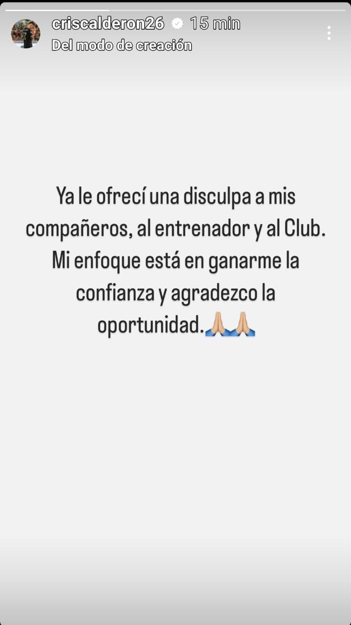 Por su parte, el Chicote Calderón redactó: "Ya le ofrecí una disculpa a mis compañeros, al entrenador y al Club. Mi enfoque está en ganarme la confianza y agradezco la oportunidad".