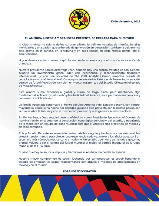 El comunicado reafirma que el América no perderá su esencia, el objetivo es seguir luchando por campeonatos y seguir llevando alegrías a los millones de aficionados que tiene el equipo en México y más allá de sus fronteras.