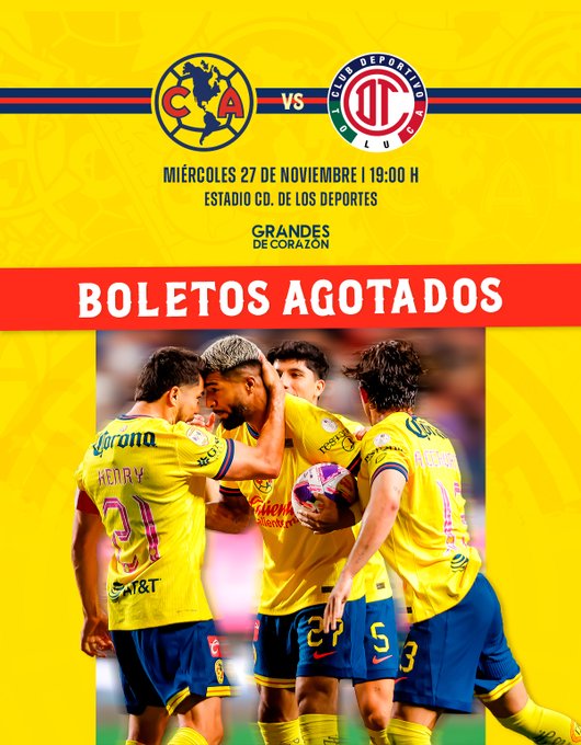 Las Águilas del América informaron, a través de sus redes sociales, que los boletos para el partido de Ida de los Cuartos de Final ante Toluca se encuentran agotados, por lo que el lleno en el Estadio Ciudad de los Deportes está garantizado.