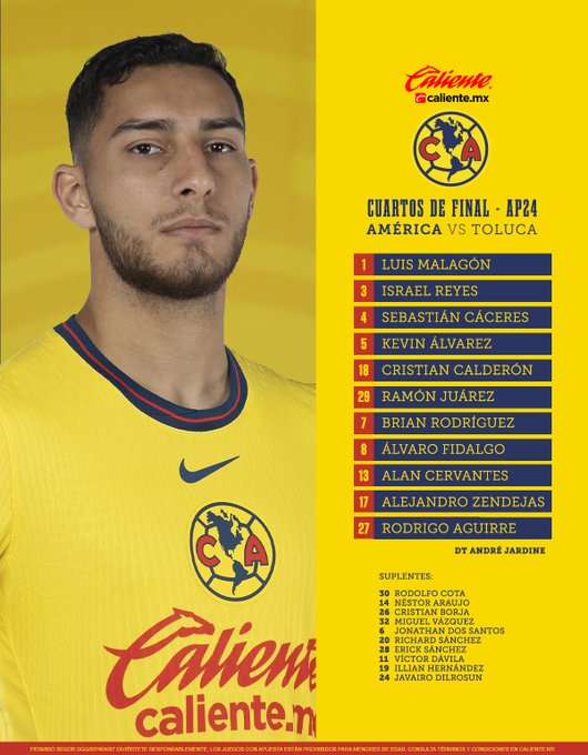 El mediocampo estará comandado por Álvaro Fidalgo y Alan Cervantes y adelante Brian Rodríguez, Alejandro Zendejas y Rodrigo Aguirre.