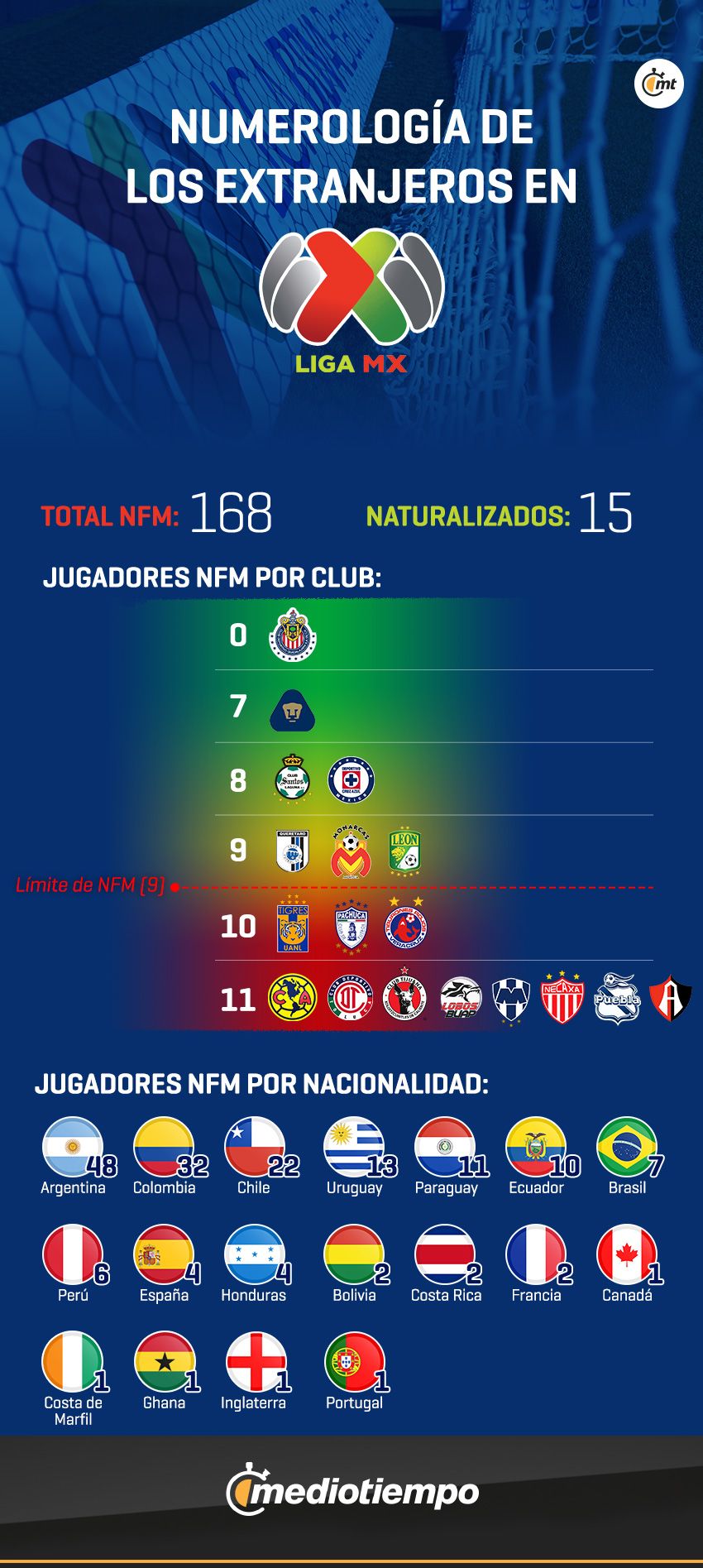 Para esta campaña serán 168 futbolistas no nacidos en territorio nacional, los que estarán participando, 15 de ellos naturalizados mexicanos, siendo Argentina y Colombia los países que más jugadores aportan al balompié nacional.