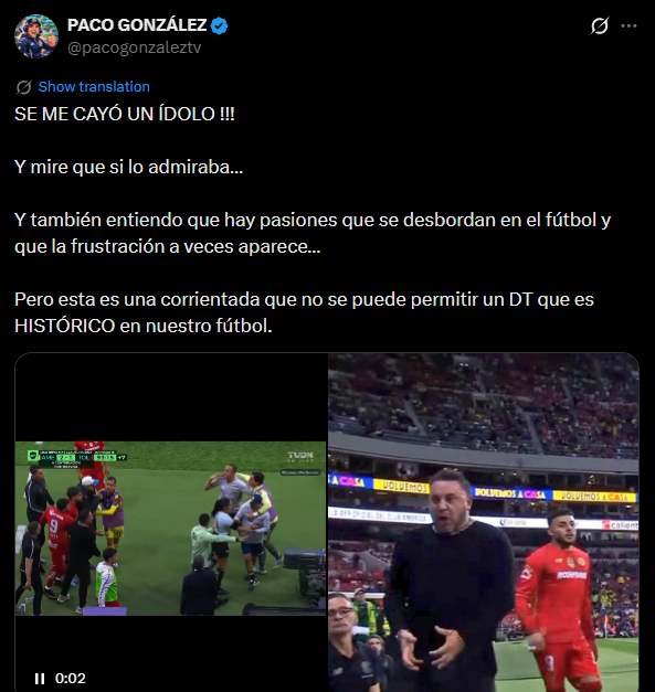 Se trata de Paco González, quien afirmó que un técnico de la talla del Turco no puede tener este tipo de "corrientadas" en un partido de futbol profesional.