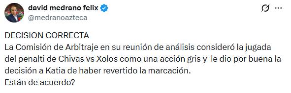 "La Comisión de Arbitraje en su reunión de análisis consideró la jugada del penalti de Chivas vs Xolos como una acción gris y le dio por buena la decisión a Katia de haber revertido la marcación"