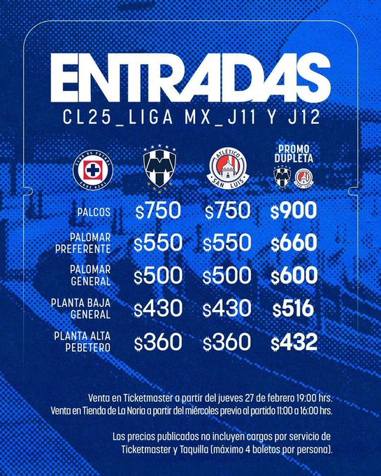 Cabe resaltar que en los precios que comparte Cruz Azul no vienen incluidos los cargos de Ticketmaster y taquilla; sólo se pueden comprar cuatro boletos por persona.