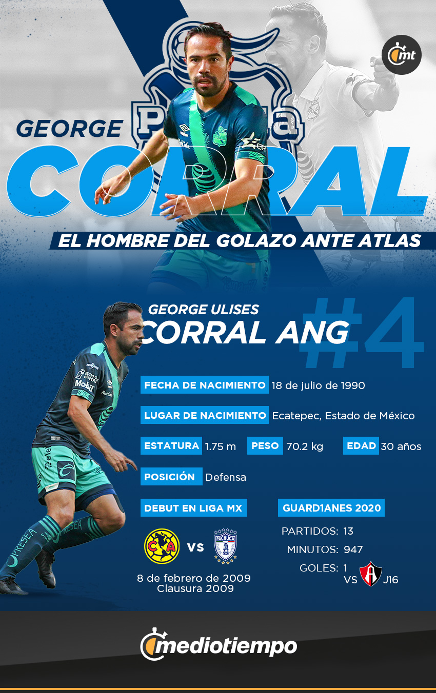 George Corral, lateral del Puebla, metió un golazo de larga distancia ante Atlas en la J16, que le dio tres puntos a los camoteros para enfilarse al Repechaje, el cual amarró en la J17 con triunfo ante San Luis. Corral metió uno de los mejores goles de los camoteros en el Guard1anes 2020.