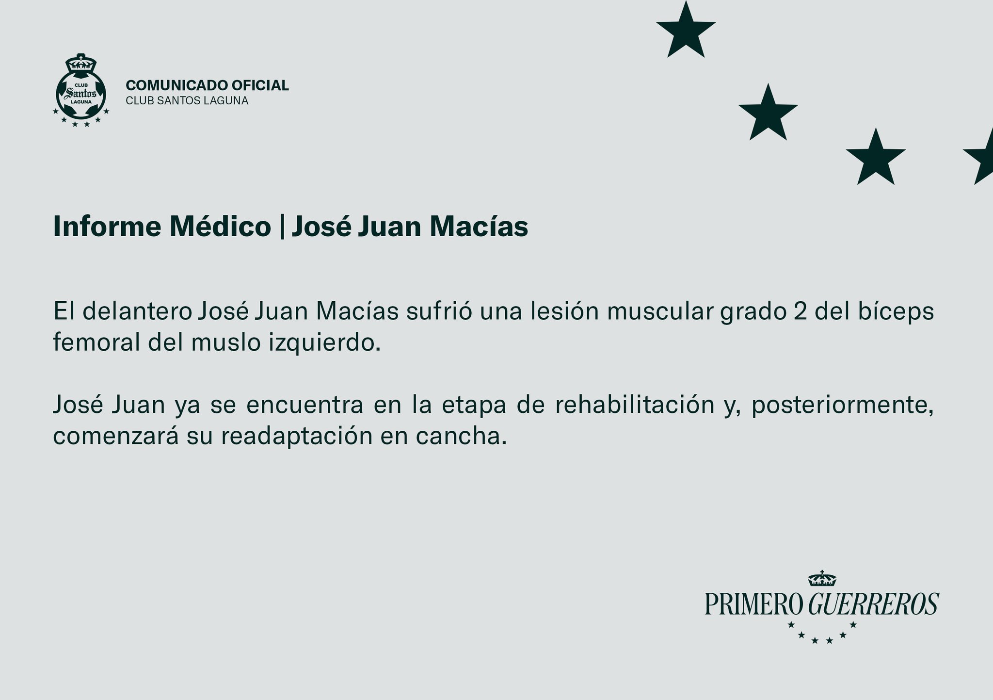 No obstante, al momento de reanudar la actividad después de la anotación, JJ se tocó la parte posterior del muslo izquierdo, hecho que llamó la atención del banquillo encabezado por Fernando “Tano” Ortiz. Días más tarde, el Club Santos Laguna dio a conocer que el parte médico de la lesión de Macías, mismo donde se reveló que el artillero sufrió una lesión muscular grado dos del bíceps femoral en el muslo izquierdo. Del mismo modo, también mencionaron que el delantero ya se encuentra en proceso de rehabilitación y una vez que esta termine comenzará su trabajo en cancha y con balón.