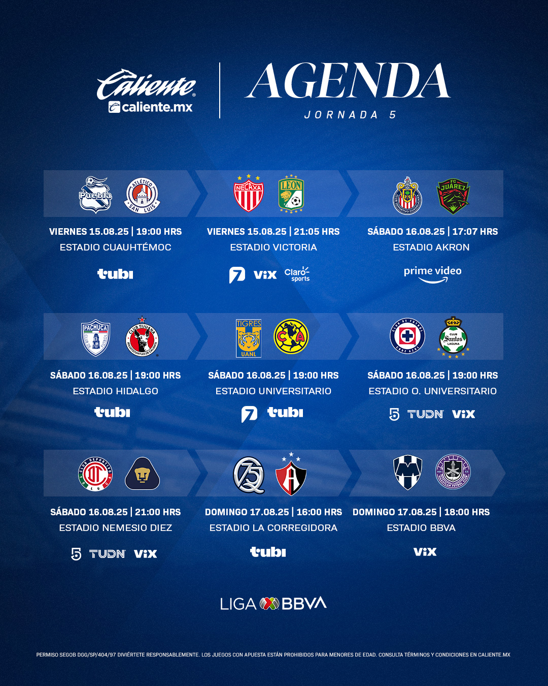 La jornada 5 del Apertura 2025 está por comenzar y vendrá acompañada de grandes encuentros, entre los cuales sobresalen Tigres vs. América y Toluca vs. Pumas, cuatro de las instituciones más atractivas en la Liga MX.