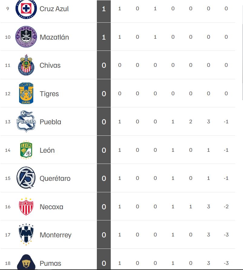 Cabe recordar que en en la Jornada 1 solo se disputaron 8 juegos, pues el Chivas vs Tigres fue reprogramado debido a los trabajaos de remodelación que se realizan en la cancha del Estadio Akron, por lo que ambos equipos no sumaron ni una unidad y por ende continuarán con esa 'desventaja' en la Tabla General.