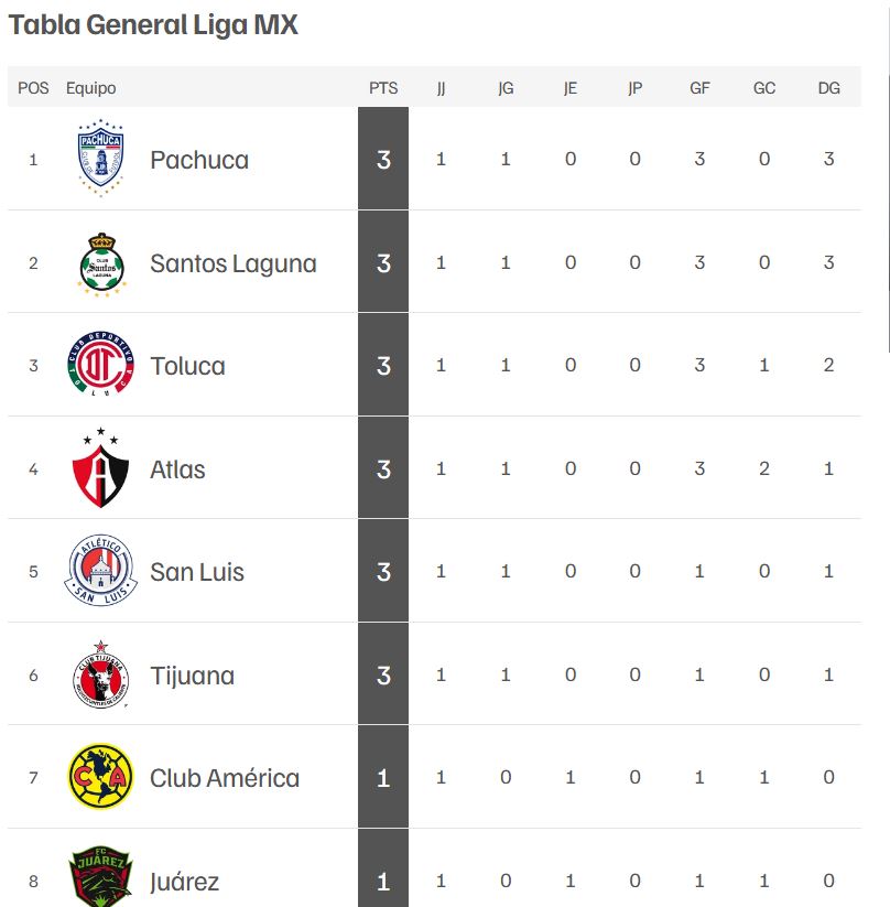 Liga MX: Así quedó la Tabla General del Apertura 2025 tras la Jornada 1
