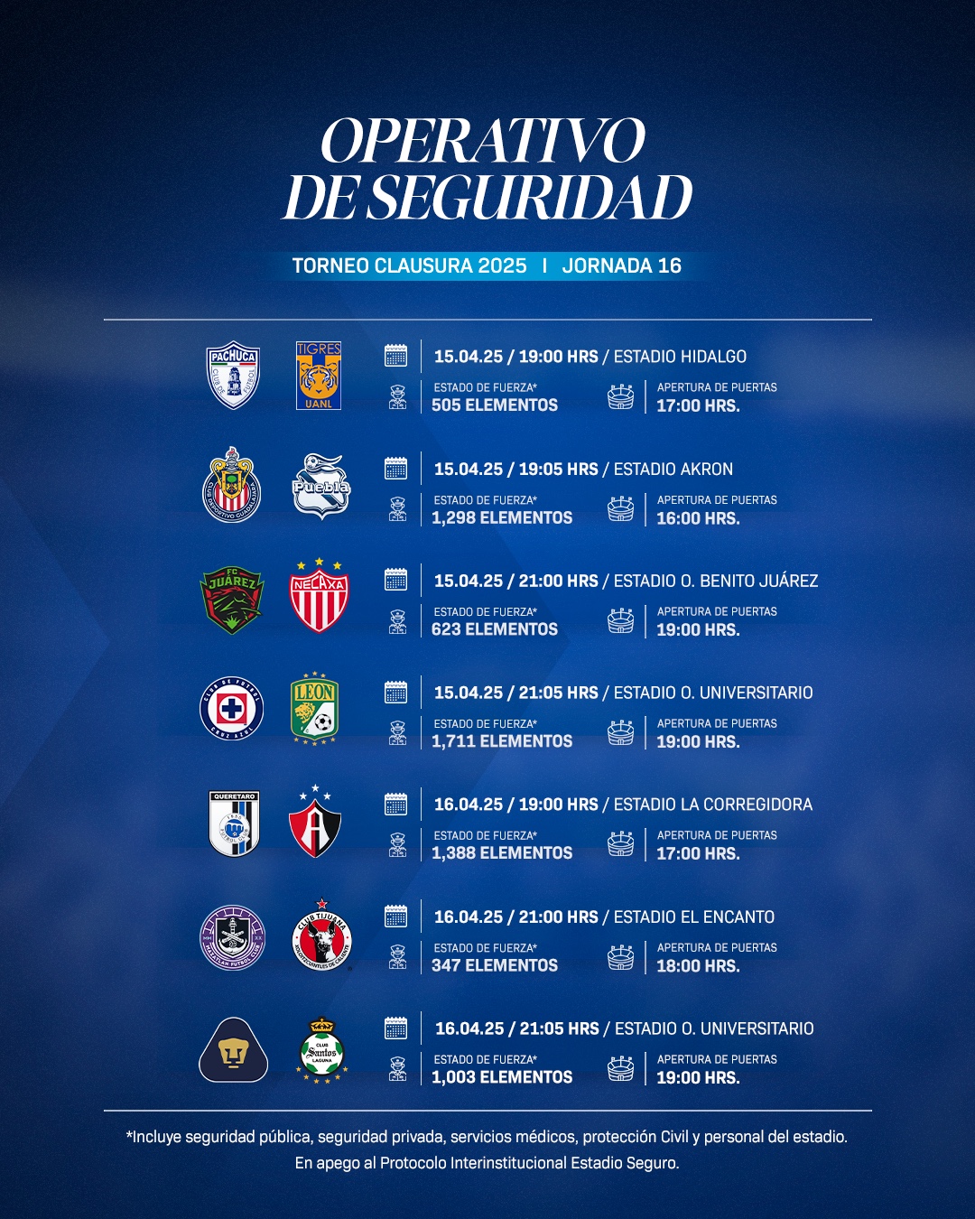 Los únicos partidos que por ahora no cuentan con un operativo de seguridad son los juegos entre Monterrey ante América y el de Atlético de San Luis frente a Toluca, los cuales se celebrarán este miércoles por la noche.
