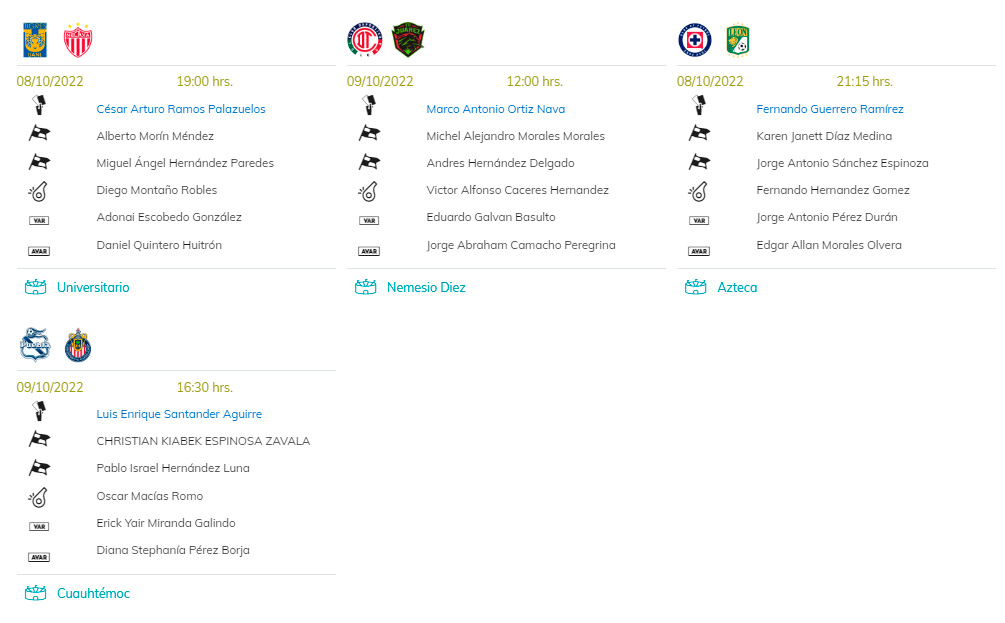 Para los duelos del sábado 8 de octubre estarán el mundialista César Arturo Ramos Palazuelos en el Tigres frente a Necaxa, mientras que el choque entre Cruz Azul y León tendrá a Fernando Guerrero como juez central.