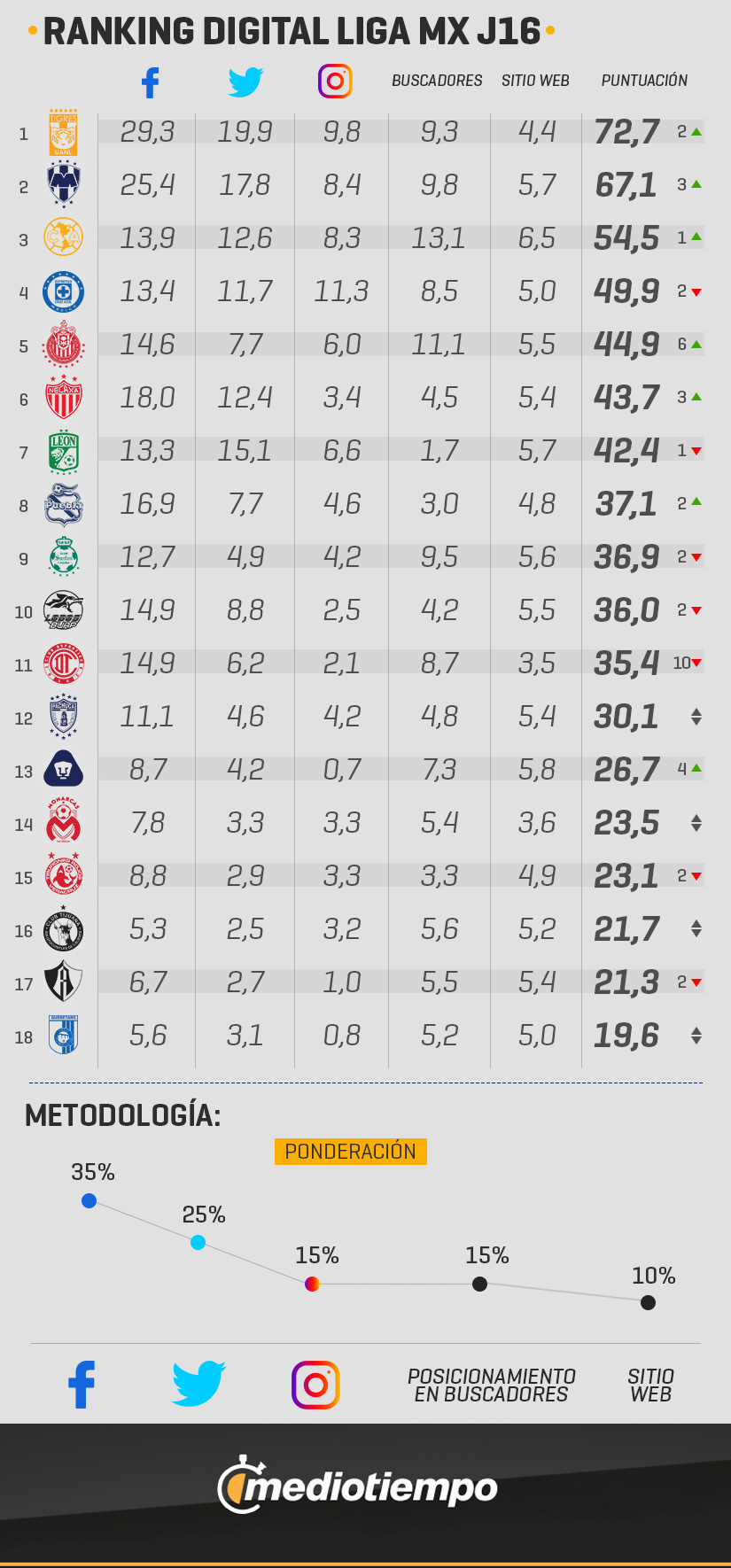 Ranking Digital: Tigres es el nuevo líder en la J16