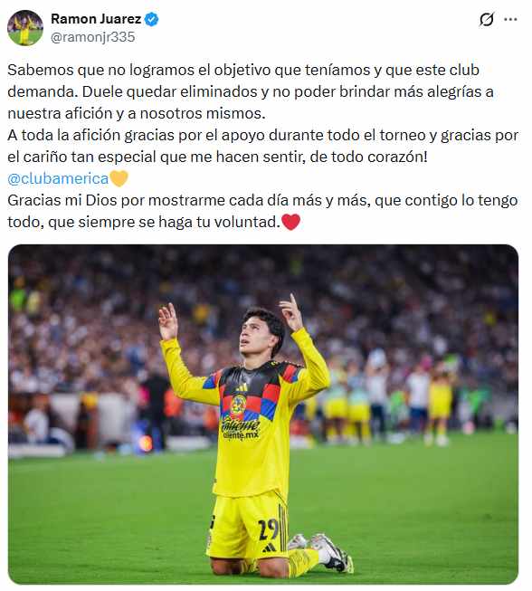 "Sabemos que no logramos el objetivo que teníamos y que este club demanda. Duele quedar eliminados y no poder brindar más alegrías a nuestra afición y a nosotros mismos. A toda la afición gracias por el apoyo durante todo el torneo y gracias por el cariño tan especial que me hacen sentir, de todo corazón. Gracias mi Dios por mostrarme cada día más y más, que contigo lo tengo todo, que siempre se haga tu voluntad"