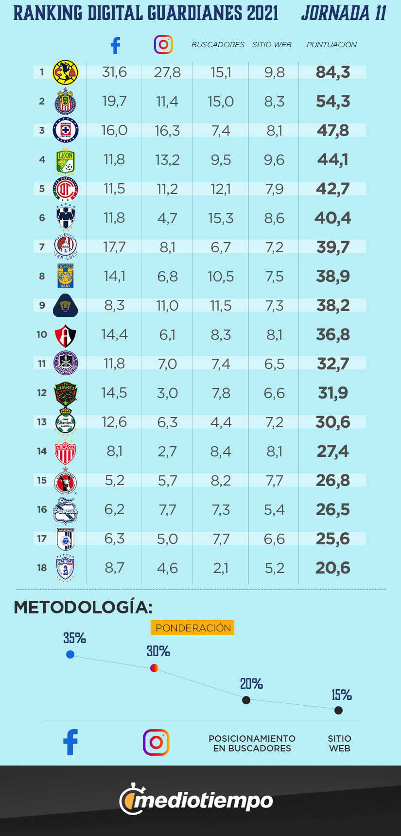 Mediotiempo presenta el ranking donde se evalúan las diferentes plataformas digitales de los 18 clubes de Liga MX en el Guard1anes 2021