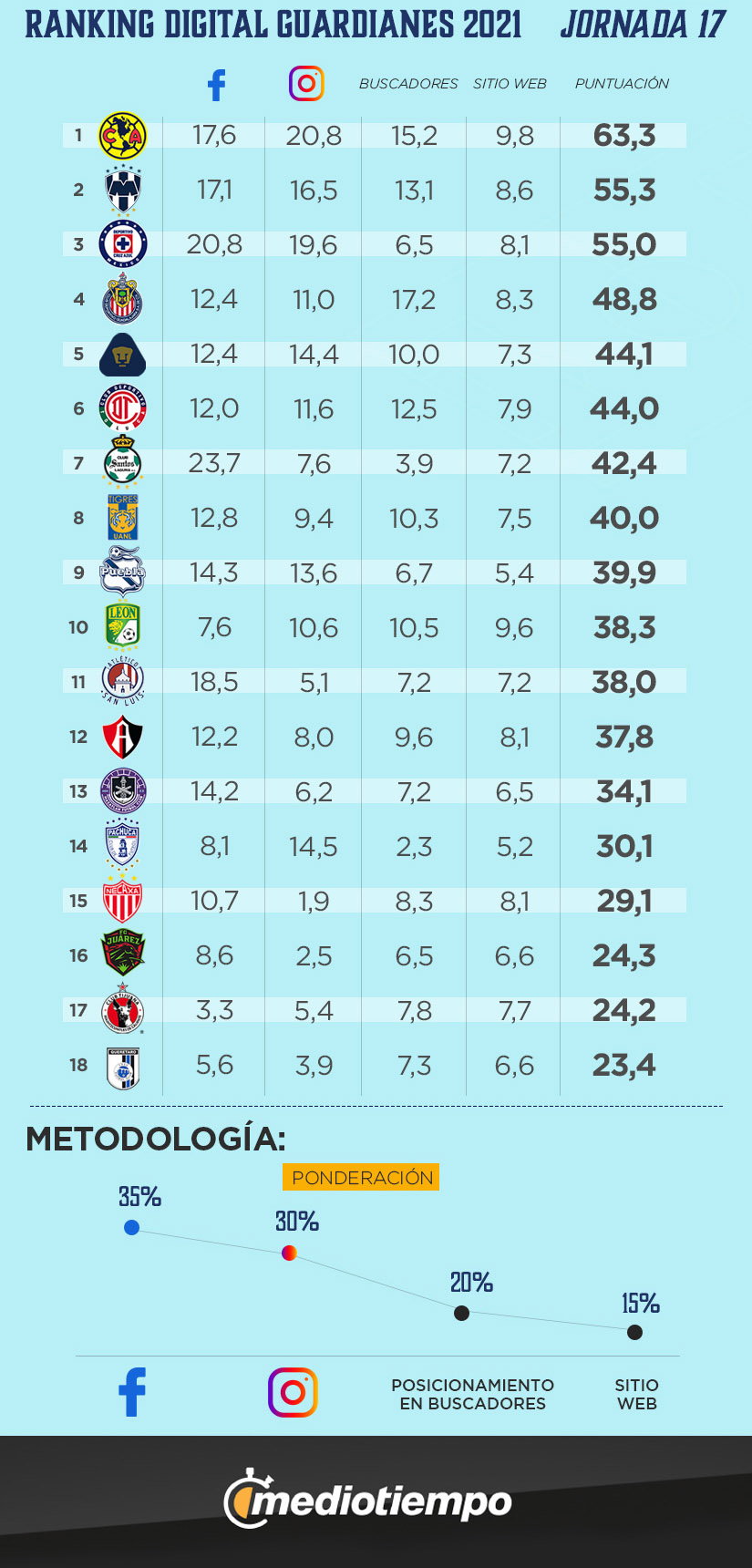 Mediotiempo presenta el ranking donde se evalúan las diferentes plataformas digitales de los 18 clubes de Liga MX en el Guard1anes 2021