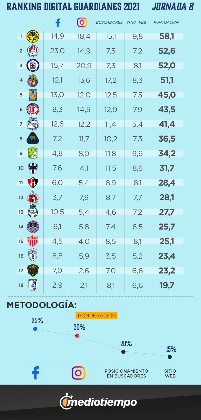Mediotiempo presenta el ranking donde se evalúan las diferentes plataformas digitales de los 18 clubes de Liga MX en el Guard1anes 2021